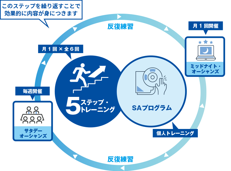 SAプログラムを身に付けて現場で成果を上げているオーシャンズ代表・三井をはじめとする認定トレーナーが明日から使える成果へのツボとコツをお届けします。